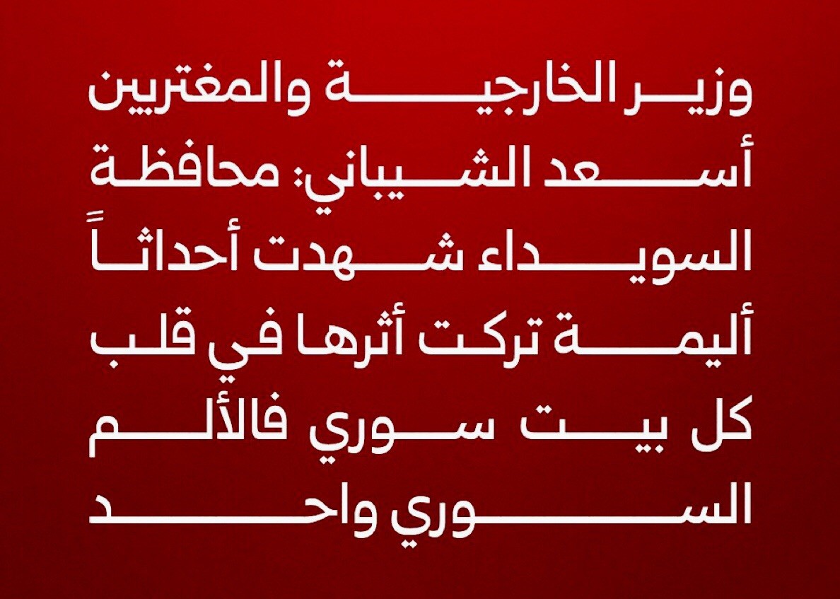 وأوضح الشيباني ، وهذا أول إقرار علني من الحكومة السورية بالاخطاء التي ارتكبت في السويداء “علمتنا التجارب لا علاج للجراح إلا بعودتنا نحن السوريين لنجلس معاً ونضمد جراحنا بأيدينا ونفتح صفحة جديدة قوامها الوحدة والمصالحة والمصير المشترك”.