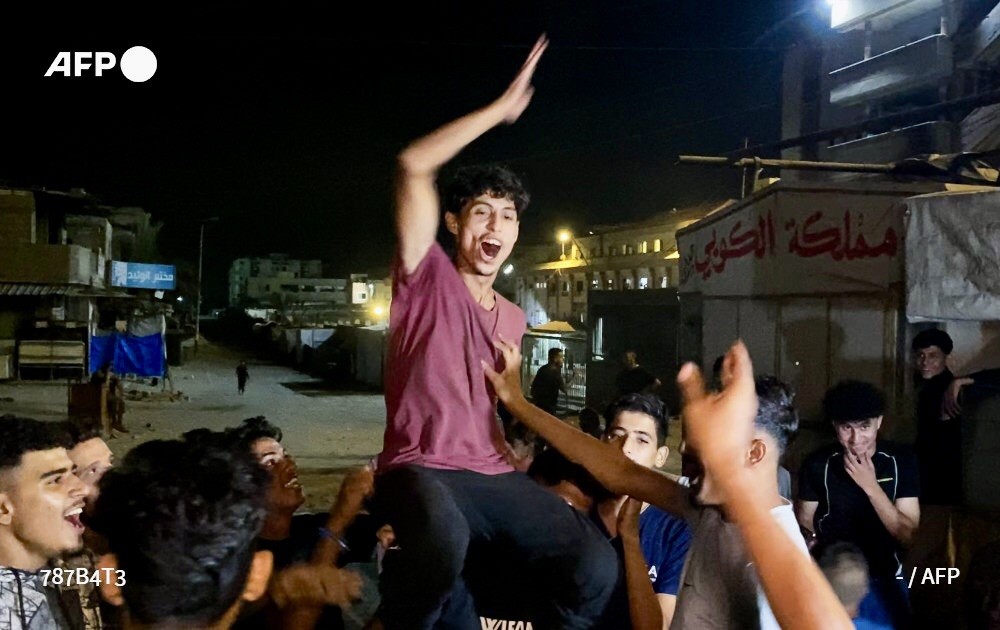 إثر إعلان الاتفاق، عمّت أجواء الفرح في منطقة المواصي في جنوب قطاع غزة التي نزح إليها آلاف الفلسطينيين.