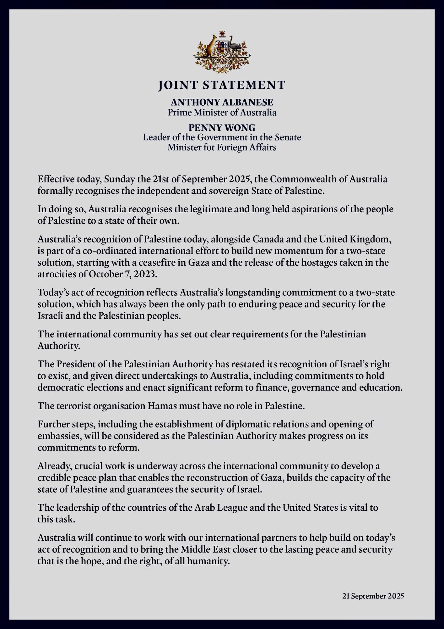 اعتبارًا من اليوم، الأحد 21 سبتمبر/أيلول 2025، تعترف رابطة الكومنولث الأسترالية رسميًا بدولة فلسطين المستقلة وذات السيادة.