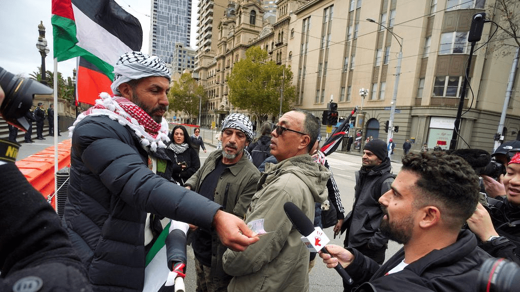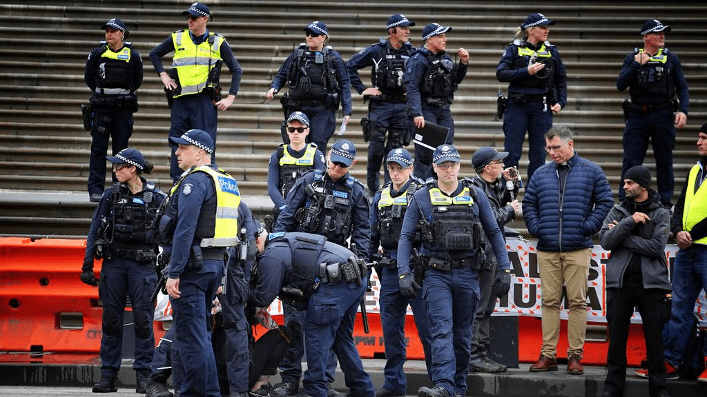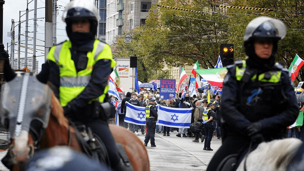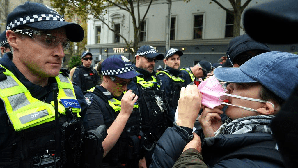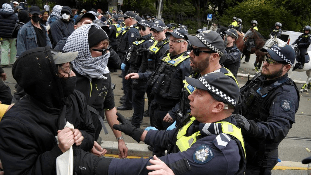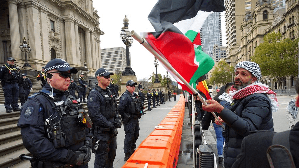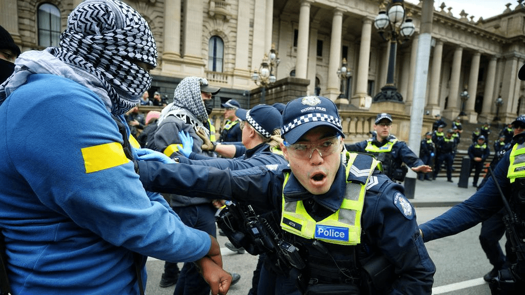 وأظهرت مشاهد مباشرة لحظة اعتقال الشرطة الأسترالية متظاهرين خلال الوقفة التضامنية التي نظمها نشطاء أمام البرلمان في مدينة ملبورن تضامنا مع فلسطين ورفضا للحرب على غزة.
