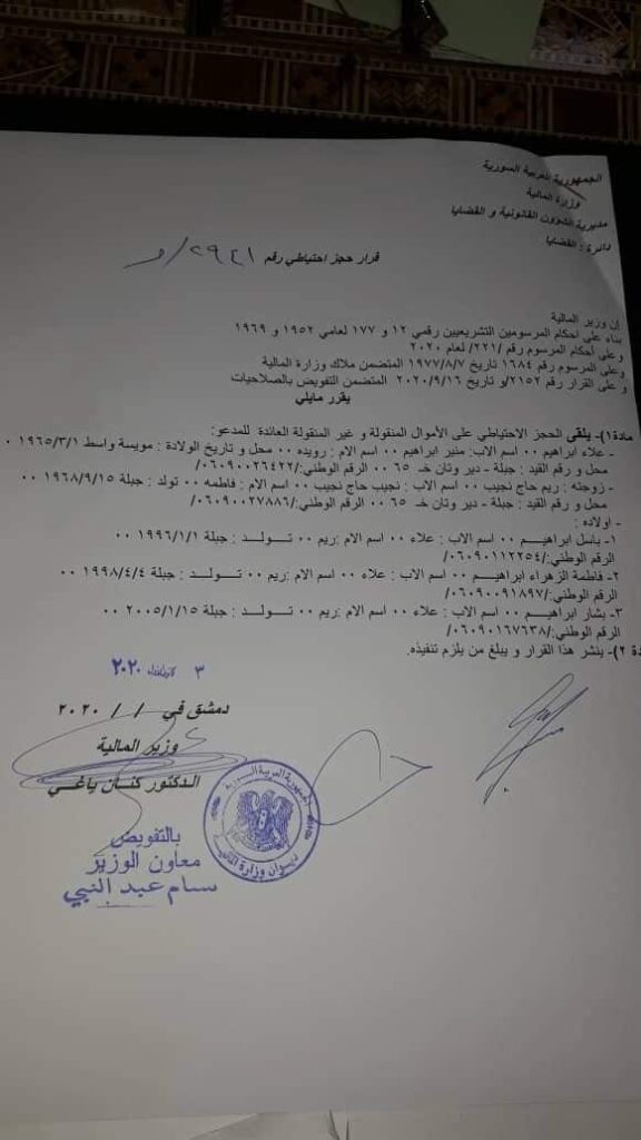 ووفقا للقرار الصادر عن وزارة المالية، والذي اطلعت عليه جريدة ” الناس الناس نيوز” الأسترالية الإلكترونية فإن القرار يقضي بالحجز الاحتياطي على الأموال المنقولة وغير المنقولة العائدة لمحافظ ريف دمشق السابق علاء إبراهيم وزوجته وأولاده.
