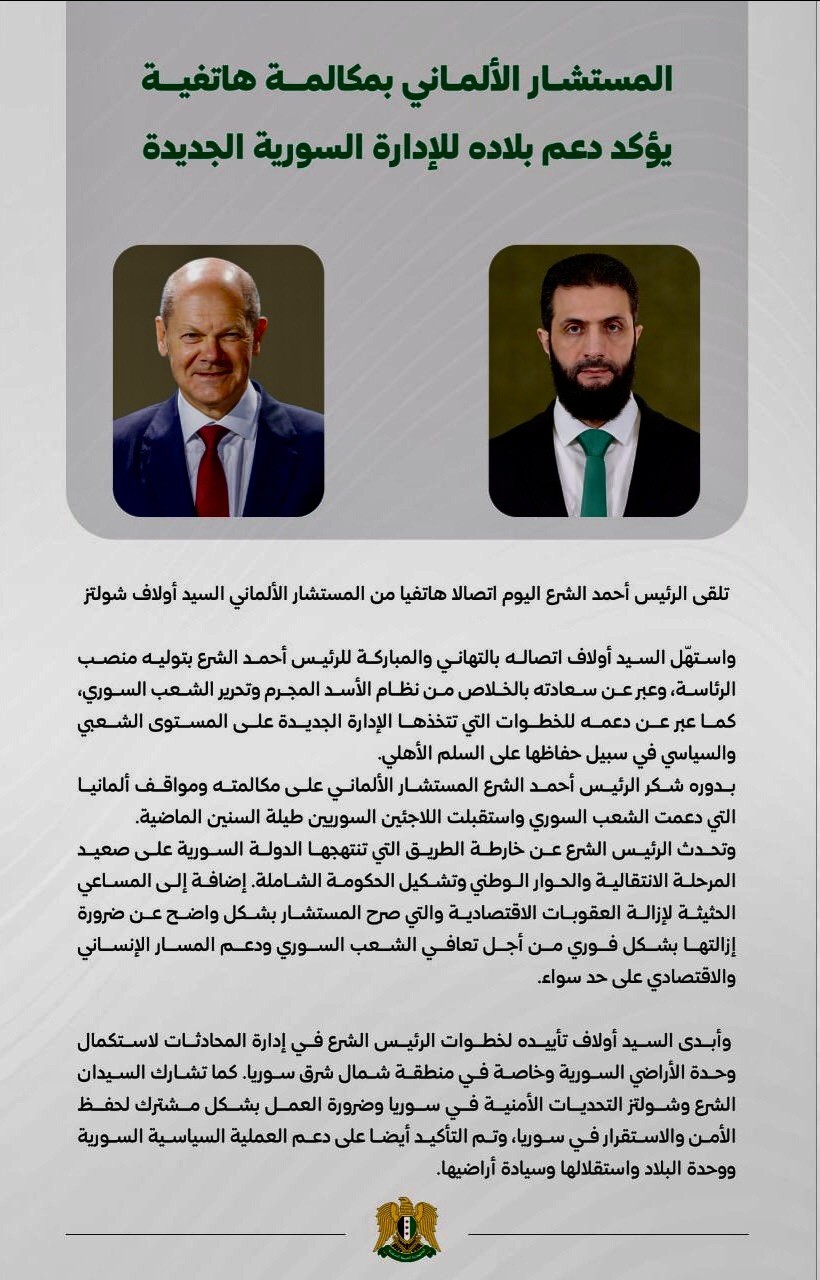 وكان رئيس الجمهورية العربية السورية السيد أحمد الشرع تلقى أمس الأول اتصالاً هاتفياً من نظيره الفرنسي إيمانويل ماكرون، هنأه فيها على توليه منصب الرئاسة، ووجّه له الدعوة لزيارة فرنسا في الأسابيع المقبلة.