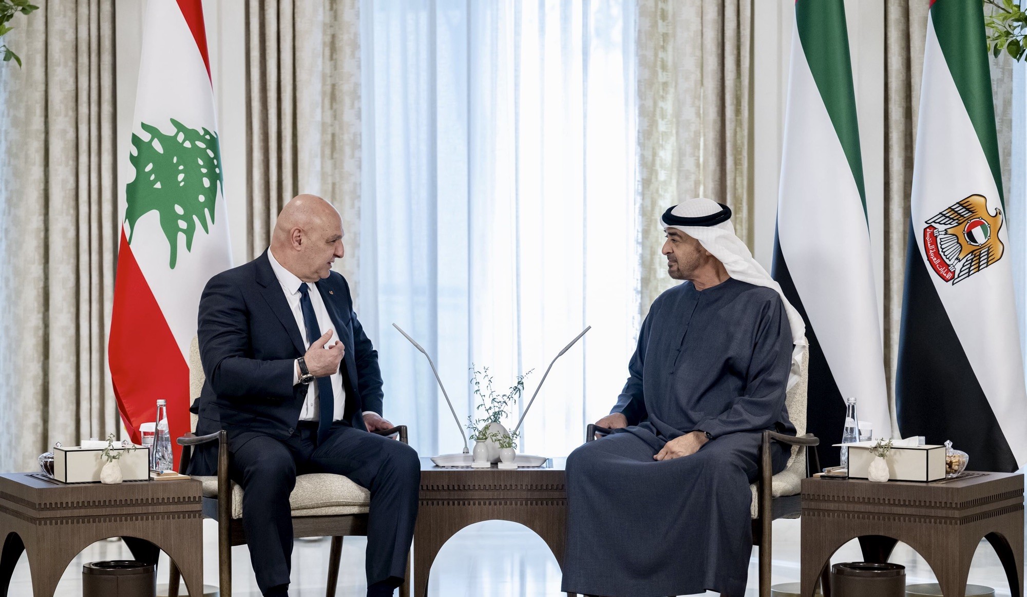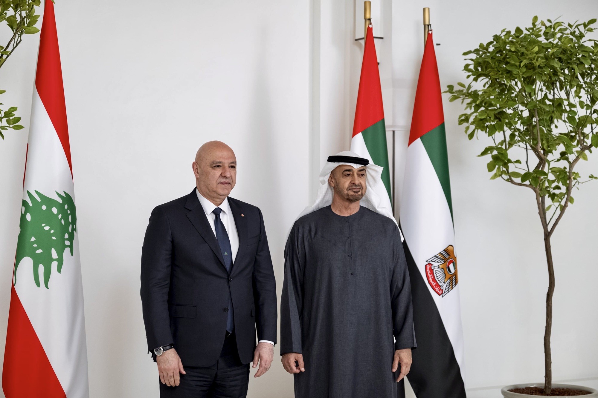 جاء ذلك خلال استقبال الرئيس محمد لنظيره اللبناني في قصر الشاطئ في العاصمة الاماراتية أبوظبي ، حيث يقوم الرئيس عون بزيارة رسمية إلى دولة الإمارات .