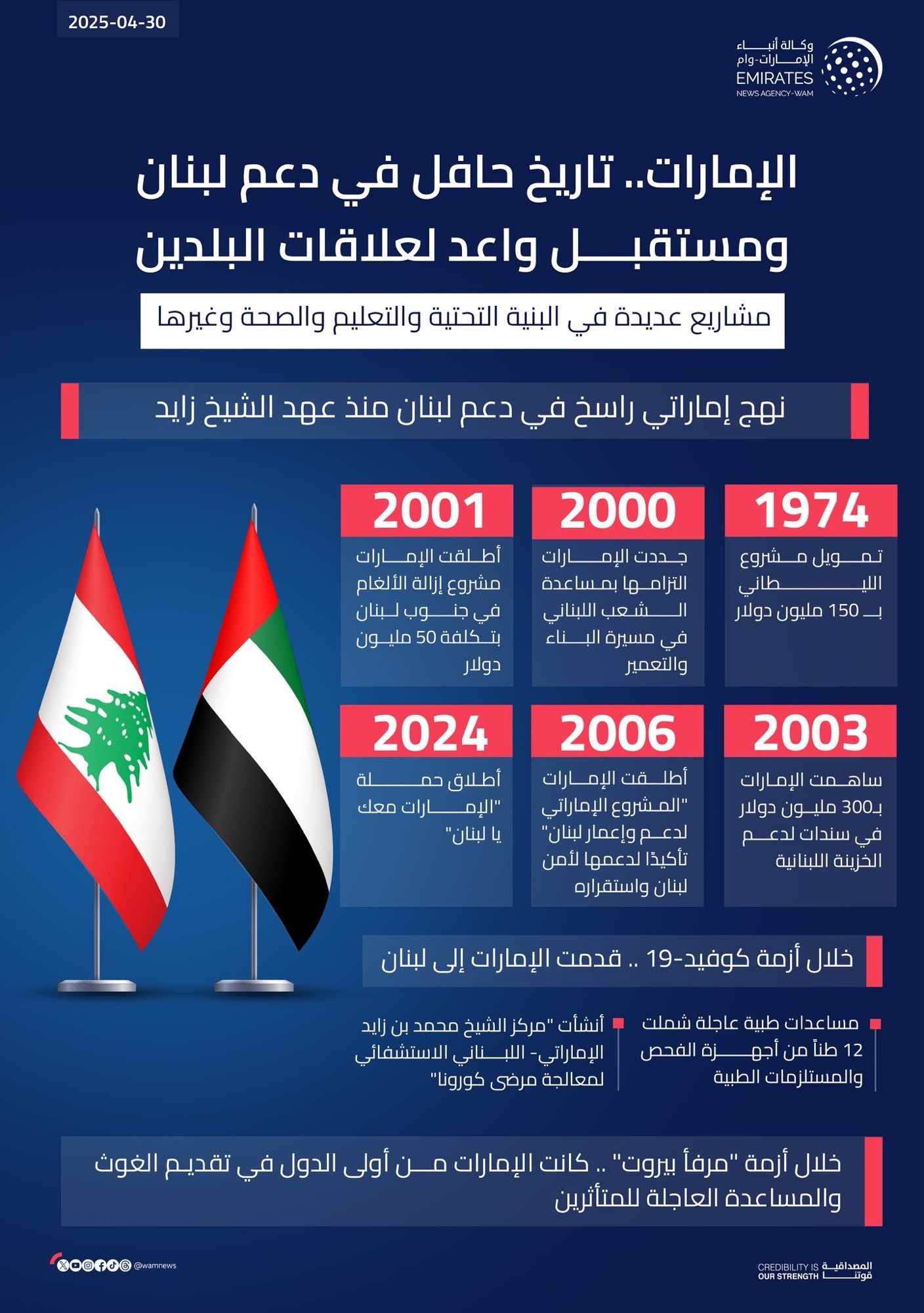وشدد صاحب السمو على موقف دولة الإمارات الداعم لتعزيز مؤسسات الدولة اللبنانية ودورها في حفظ السيادة والأمن والاستقرار في البلاد إضافة إلى دعم وحدة لبنان وسلامة أراضيه.
