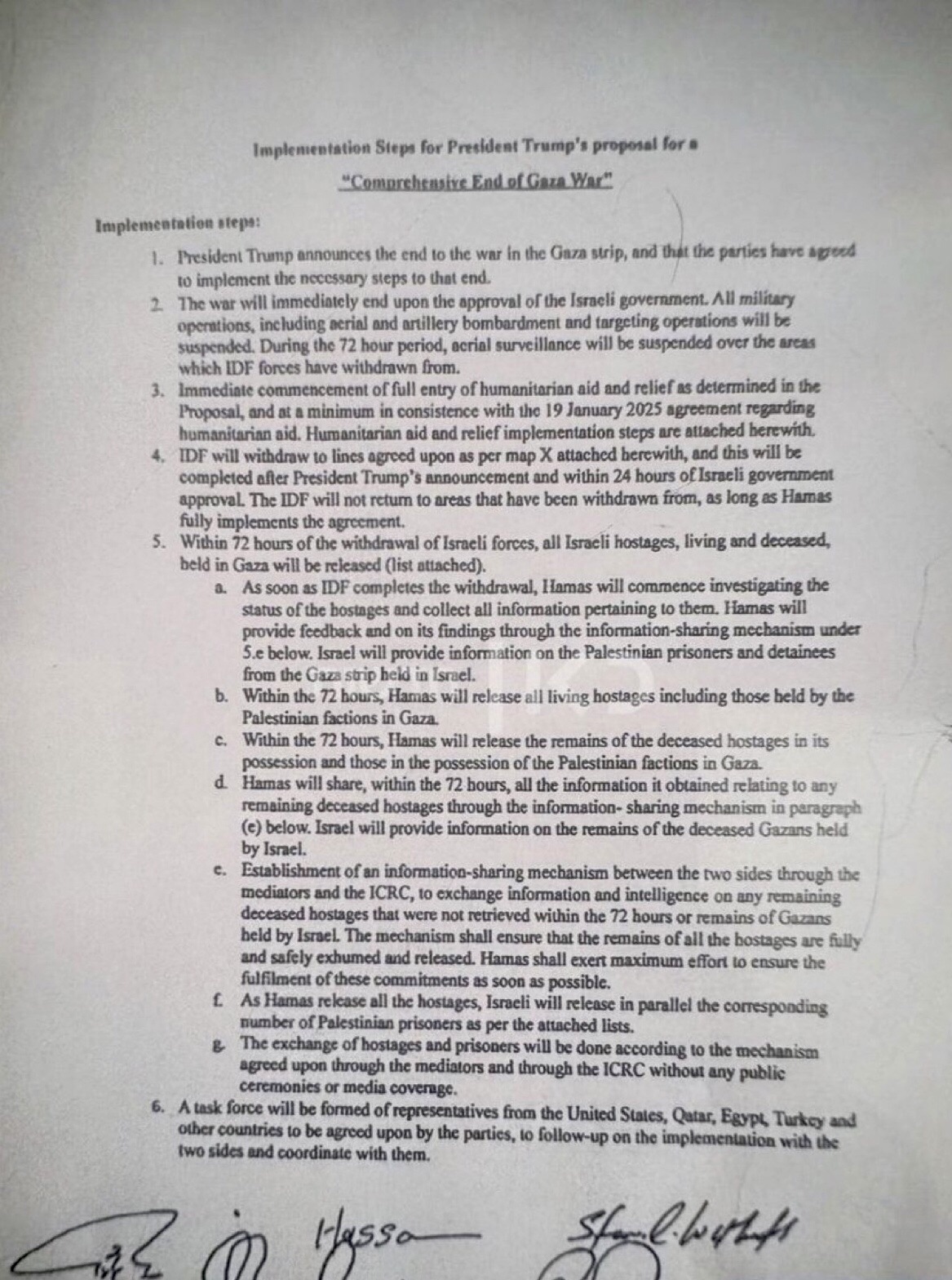 - خلال 72 ساعة من انسحاب القوات الإسرائيلية، سيتم الإفراج عن جميع الرهائن الإسرائيليين، الأحياء والأموات، المحتجزين في غزة (القائمة مرفقة).
