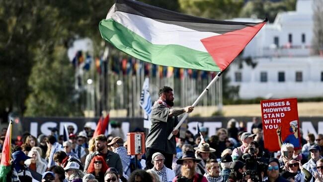 احتشد متظاهرون مناهضون لإسرائيل أمام مبنى البرلمان الأسترالي في العاصمة كانبيرا ، حاملين لافتات “هتلر بشع”، في تظاهرة عارمة شارك فيها أعضاء مجلس الشيوخ من حزب الخضر.