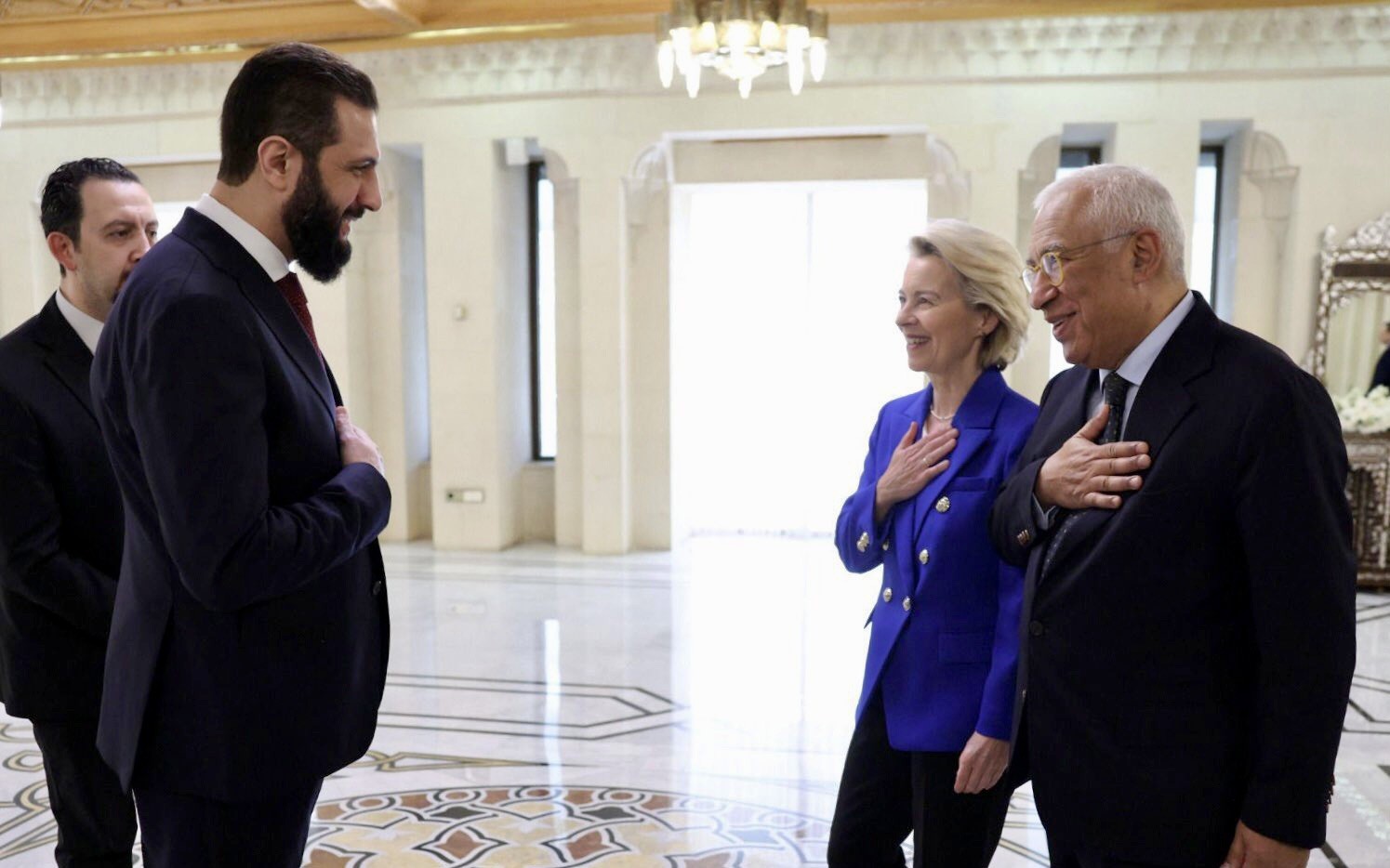 ولم يصافح المسؤول الأوروبي الرفيع المستوى يد الرئيس الشرع في حركة دبلوماسية فسرت على آنها تضامن مع زميلته رئيسة المفوضية الأوروبية ، لان الشرع لا يصافح نساء.