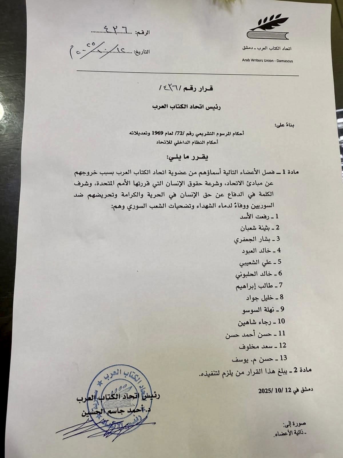 قالت وسائل إعلام سورية محلية ، ومنصات تواصل إجتماعي إن رئيس أتحاد الكتاب العرب الدكتور أحمد جاسم الحسين أصدر قراراً بفصل بموجبه عم بشار الأسد وثلة من زمرة النظام البائد من أتحاد الكتاب على اعتبار مشاركتهم في قتل الشعب السوري الثائر في وجه النظام الأسدي.
