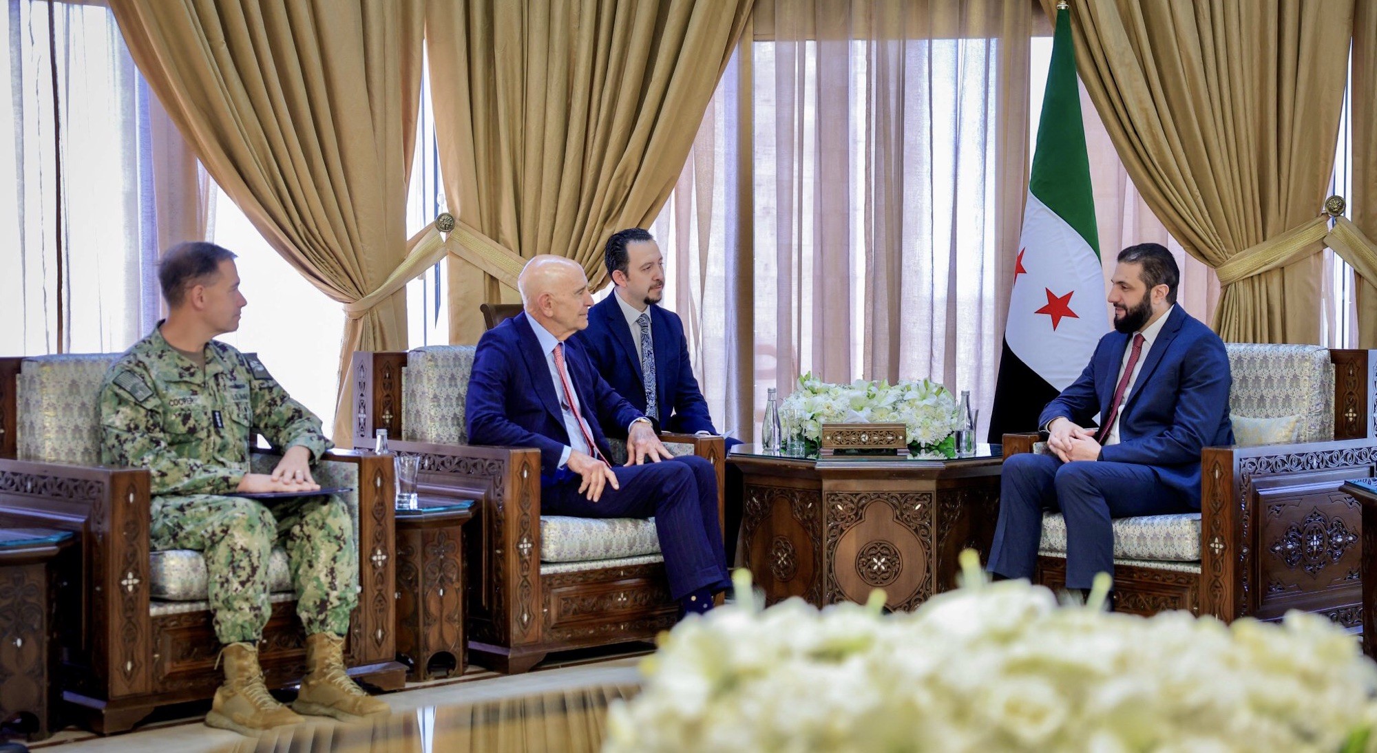 بحث الرئيس السوري أحمد الشرع في العاصمة دمشق مع المبعوث الأمريكي الخاص إلى سوريا السفير توماس باراك وقائد القيادة المركزية الأمريكية الأدميرال براد كوبر ، آخر المستجدات في الوضع السوري .