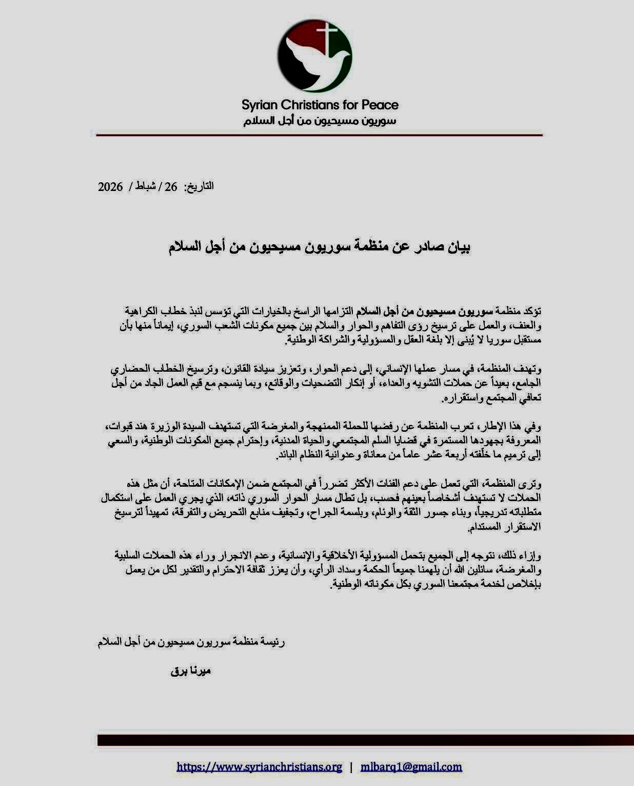 وفي هذا الإطار، تعرب المنظمة المسيحية من أجل السلام عن رفضها للحملة الممنهجة والمغرضة التي تستهدف السيدة الوزيرة هند قبوات، المعروفة بجهودها المستمرة في قضايا السلم المجتمعي والحياة المدنية، وإحترام جميع المكونات الوطنية، والسعي إلى ترميم ما خلّفته أربعة عشر عاماً من معاناة وعدوانية النظام البائد.