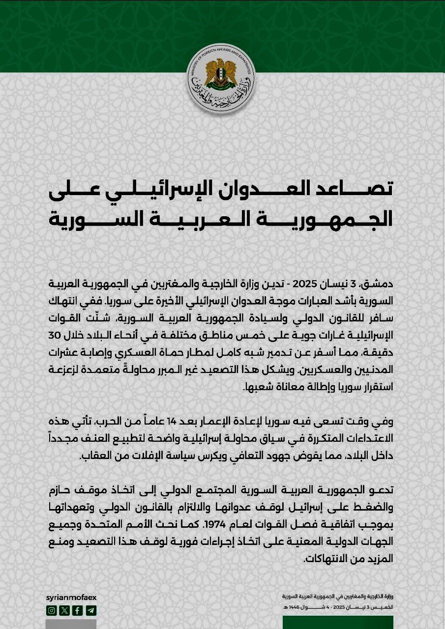 وأكدت الخارجية أن هذا التصعيد غير المبرر هو “محاولة متعمدة لزعزعة استقرار سوريا وإطالة معاناة شعبها”، لافتة إلى أنه وفي وقت تسعى فيه سوريا لإعادة الإعمار بعد 14 عاماً من الحرب، تأتي هذه الاعتداءات المتكررة في سياق محاولة إسرائيلية واضحة لتطبيع العنف مجدداً داخل البلاد، مما يقوض جهود التعافي ويكرس سياسة الإفلات من العقاب.