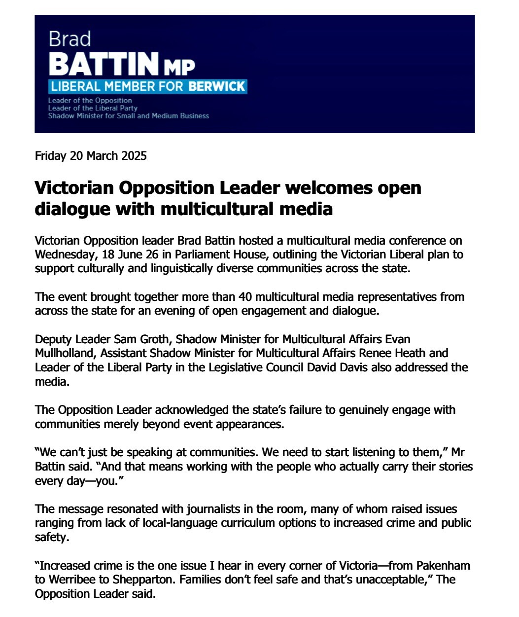 استضاف زعيم المعارضة في ولاية فيكتوريا، براد باتين، مؤتمرًا إعلاميًا متعدد الثقافات يوم الأربعاء 18 حزيران يونيو في مبنى البرلمان، موضحًا خطة الحزب الليبرالي في ولاية فيكتوريا لدعم المجتمعات المتنوعة ثقافيًا ولغويًا في جميع أنحاء الولاية.