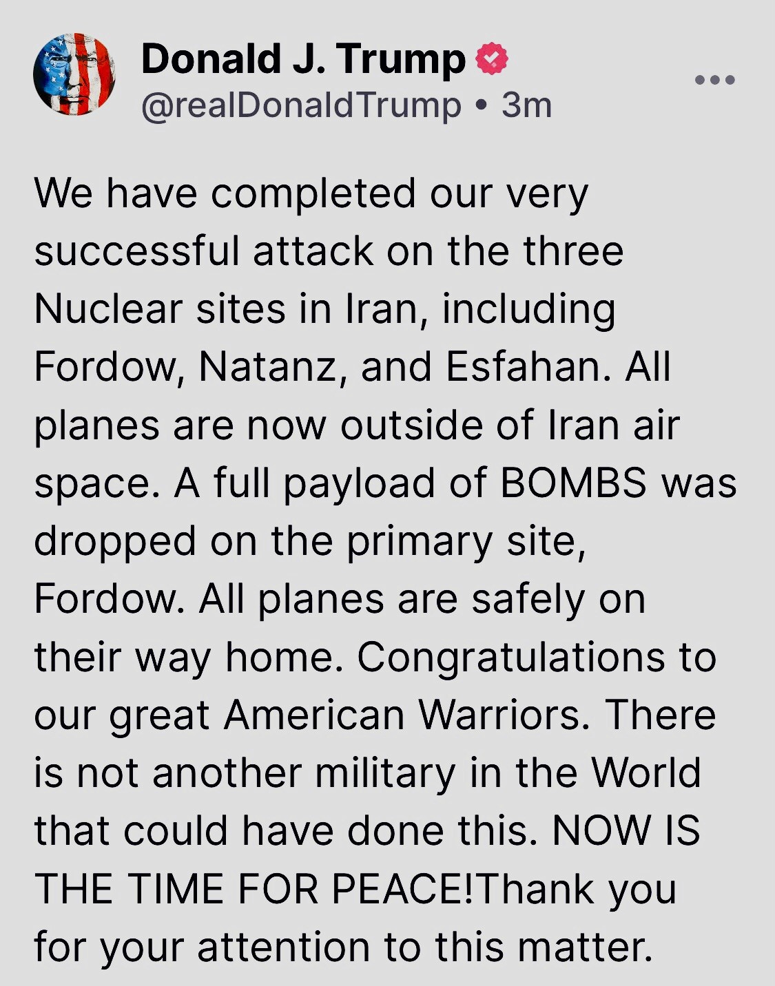 وقال ترامب في منشور على “تروث سوشال”: “أكملنا هجومنا الناجح جدا على المواقع النووية الثلاثة في إيران، بما في ذلك فوردو ونطنز وأصفهان”.