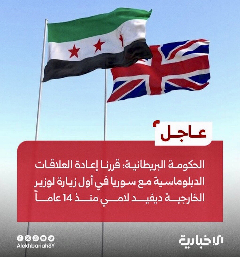 وأعلن الوزير لامي إعادة افتتاح سفارة بلاده في العاصمة السورية دمشق التي كانت أغلقت لنحو 14 عاماً ، بسبب موقف بريطانيا من نظام بشار الأسد الهارب.