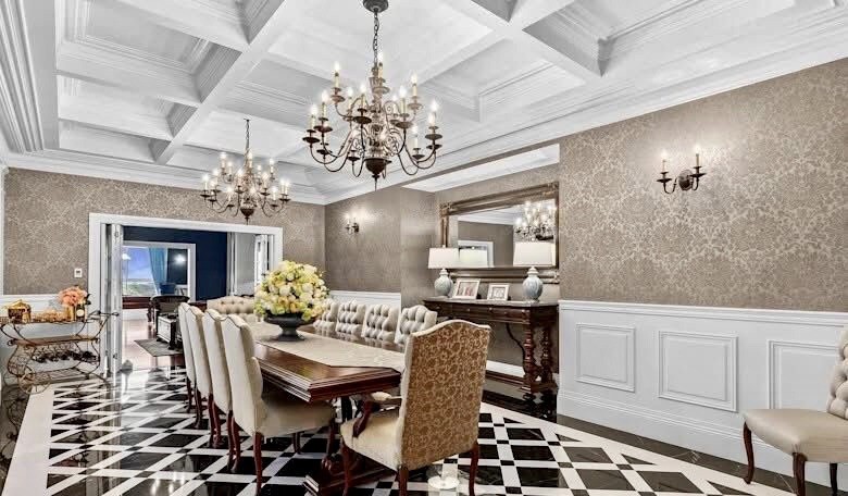تتميز غرفة الطعام بأسقف مزخرفة، ومطبخ أنيق من الرخام الأبيض، وورق جدران منقوش، وأرضيات لامعة، وسجاد فاخر، وثريات.