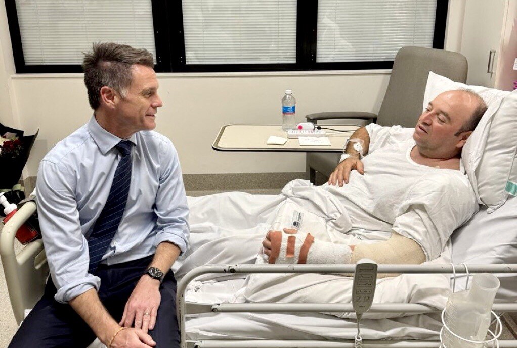 نشر كريس مينز، رئيس حكومة ولاية نيو ساوث ويلز الأسترالية، على حسابه في منصة X إكس، صورة لأحمد البالغ من العمر 43 عاماً من على سرير المستشفى، خلال زيارته اليوم الاثنين.