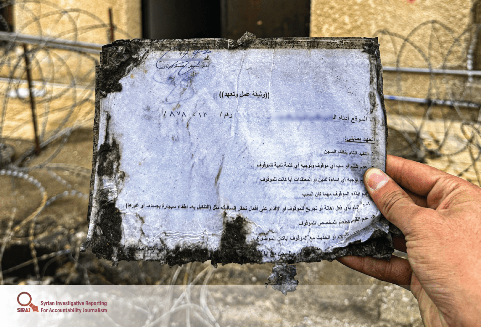 كانت الوثائق ملقاة ومبعثرة في كل مكان ضمن بهو السجن، وكانت عبارة عن تعهدات خطية مرقمة ومؤرخة وممهورة بتوقيع إداريين وسجانين بأسمائهم الصريحة وألقابهم العسكرية، تحوي كل واحدة منها بصمة “الموظف” ورتبته وتحمل عنوان “وثيقة عمل وتعهد”، والإخلال بها يترك “الموظف” تحت طائلة “المسؤولية القضائية”، ويوقع على الورقة مدير السجن محمود أحمد معتوق، الذي مات عام 2018 في “ظروف غامضة”.