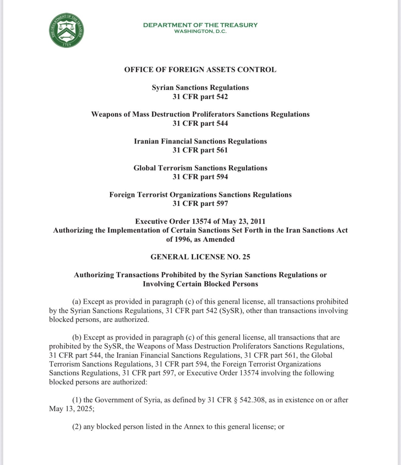 أصدر مكتب مراقبة الأصول الأجنبية التابع لوزارة الخزانة الأمريكية (OFAC) الرخصة العامة رقم 25 (GL 25) لتقديم إعفاء فوري من العقوبات المفروضة على سوريا، تماشياً مع إعلان الرئيس دونالد ترامب بشأن وقف جميع العقوبات على سوريا.