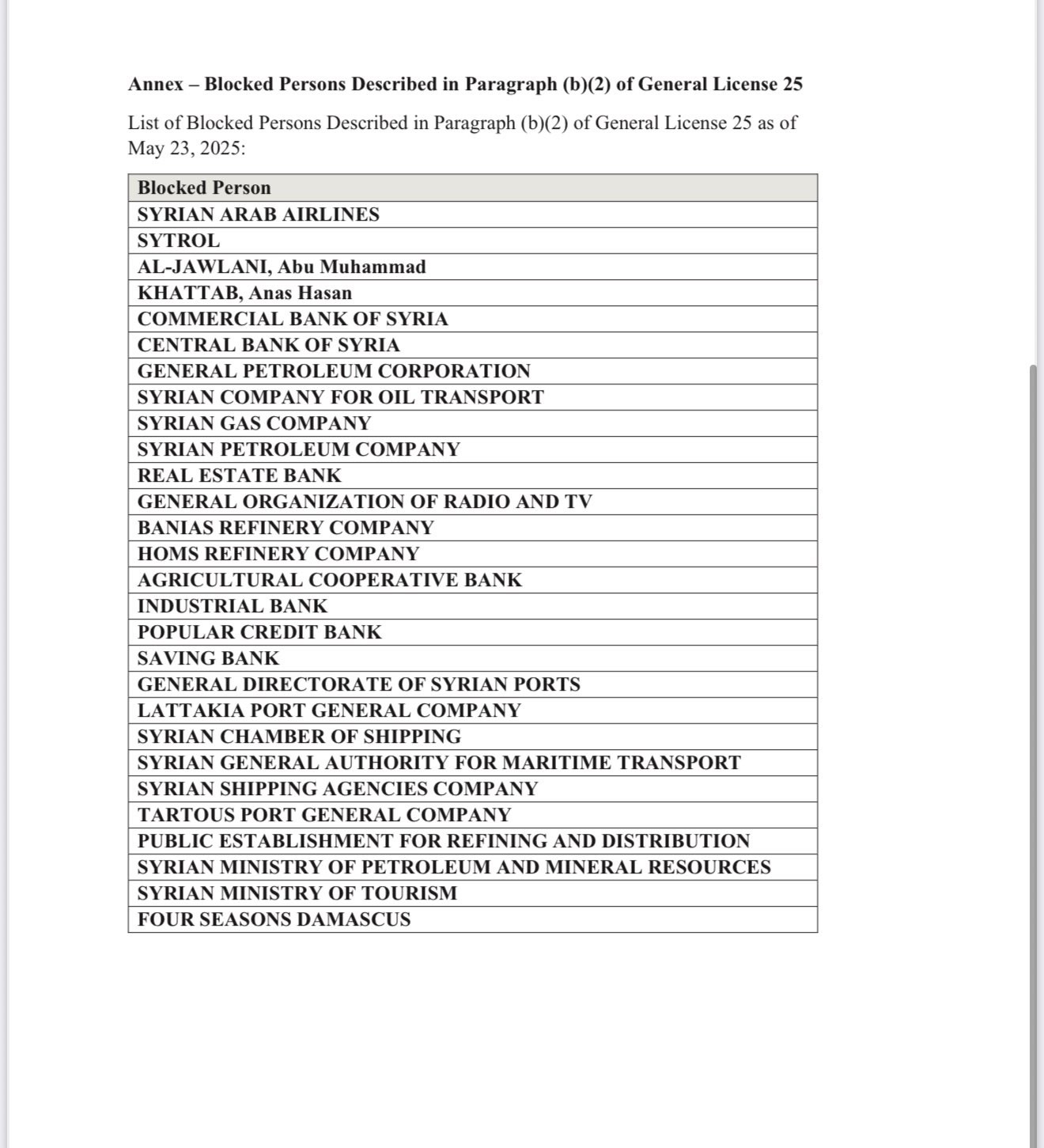 تُجيز GL 25 المعاملات المحظورة بموجب لوائح العقوبات السورية، مما يعني فعلياً رفع العقوبات عن سوريا.