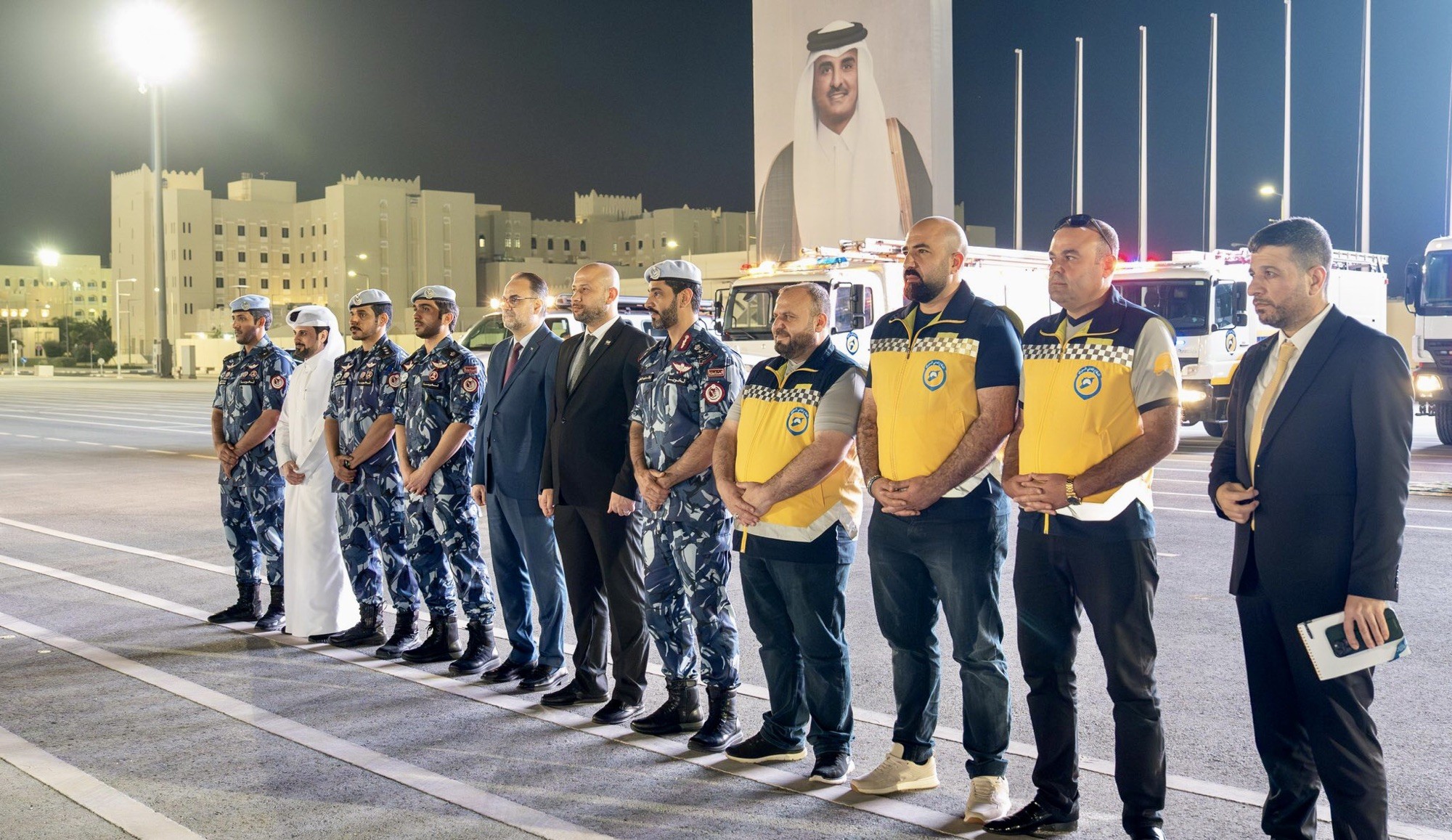 وحضر التسليم أمس الثلاثاء 29 ابريل نيسان، وزير الطوارئ والكوارث بالجمهورية العربية السورية رائد الصالح ، والعميد الركن القطري نواف ماجد العلي مساعد قائد (لخويا) للعمليات الأمنية، والقائم بالأعمال في السفارة السورية بالدوحة الدكتور بلال تركية ، ورئيس منظمة الخوذ البيضاء السيد منير مصطفى.
