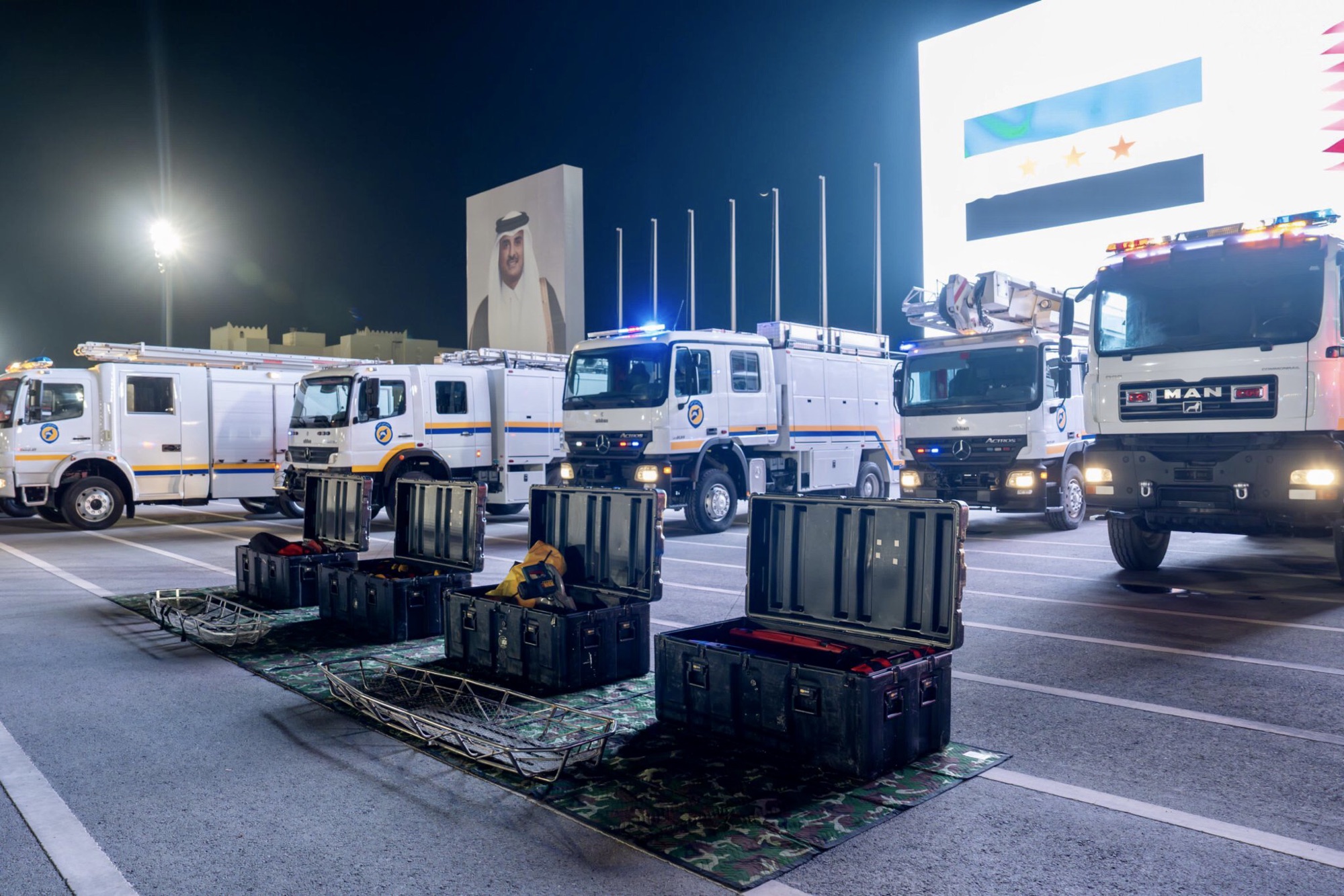 وقالت منظمة الدفاع المدني السوري (الخوذ البيضاء)، في بيان لها إنها تسلمت حزمة مساعدات لوجستية مقدمة من مجموعة البحث والإنقاذ القطرية الدولية بقوى الأمن الداخلي (لخويا) ، تضمنت معدات وآليات وأجهزة متخصصة في عمليات البحث والإنقاذ والاستجابة للطوارئ، وذلك في مقر (لخويا) بالدحيل ، بدولة قطر.
