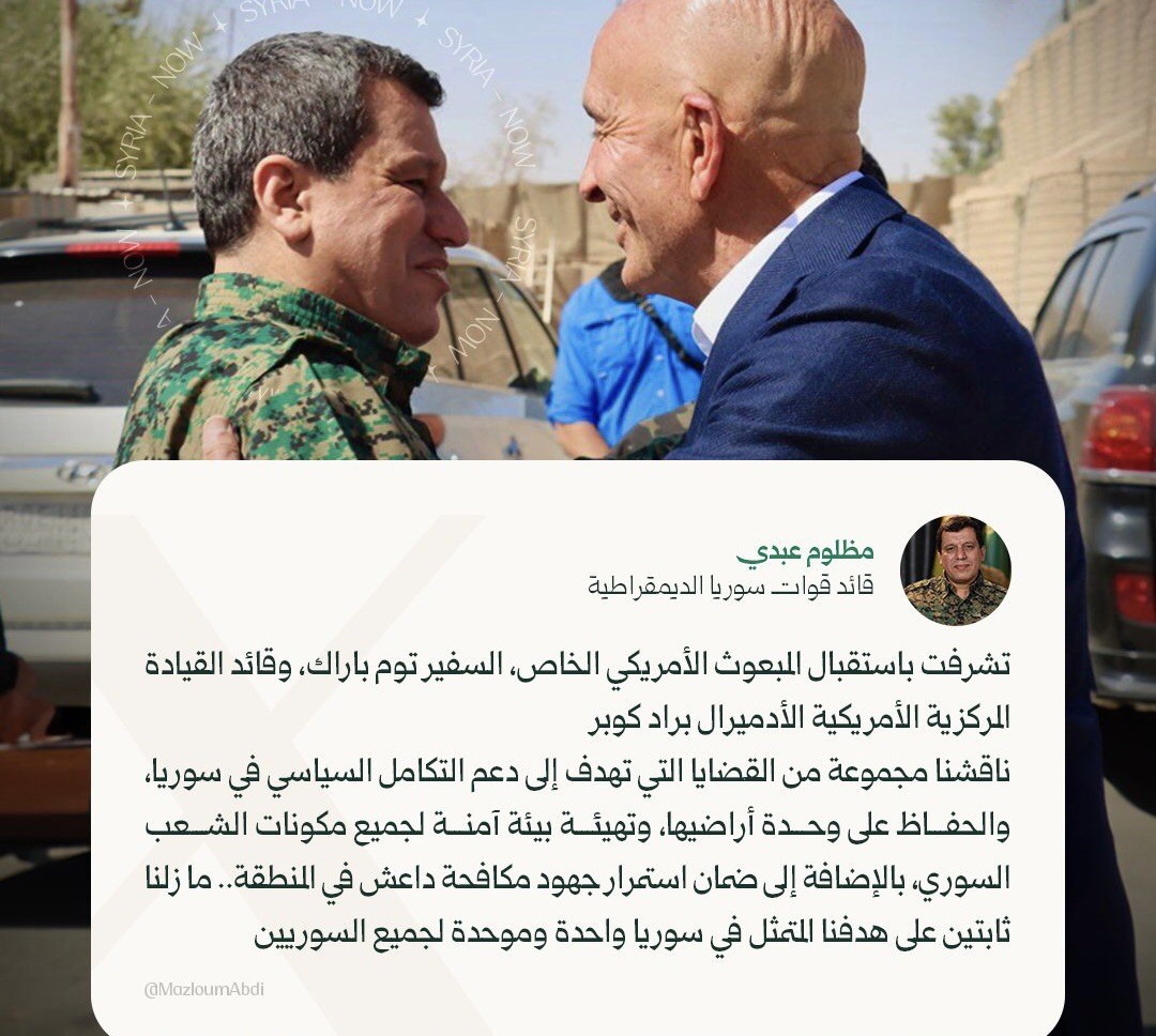 قال السفير الاميركي في تركيا ومبعوث الإدارة الأميركية إلى سوريا ولبنان توماس براك “لقد زرتُ شمال شرق سوريا اليوم ( الإثنين ) برفقة قائد القيادة المركزية الأمريكية الأدميرال كوبر لإجراء محادثات جوهرية مع مظلوم عبدي وقوات سوريا الديمقراطية (SDF).