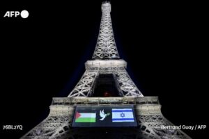 باريس وكالات – الناس نيوز :: عُرض العلمان الفلسطيني والإسرائيلي تتوسطهما صورة حمامة تحمل غصن زيتون، على برج إيفل مساء الأحد، قبل اعتراف #فرنسا الرسمي...