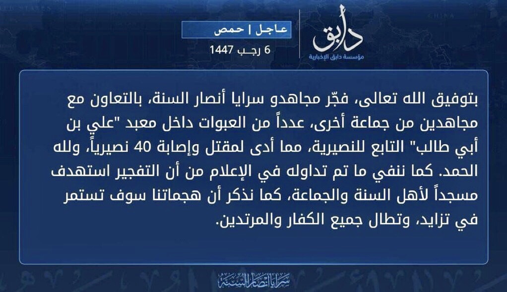 قتل ما لا يقل عن 8 اشخاص وجرح نحو 17 في تفجيرا بعبوات ناسفة استهدف مسجد علي بن أبي طالب في حي وادي الذهب بمدينة حمص وسط سوريا ، اليوم الجمعة.